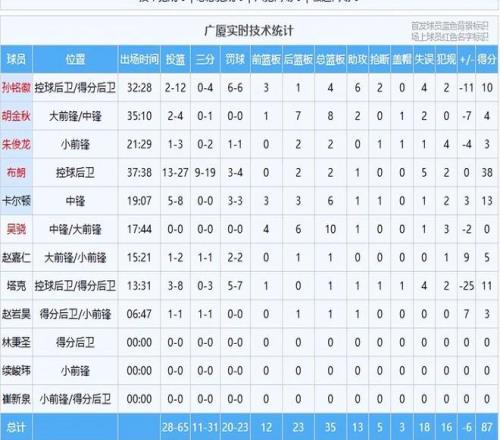 外援布朗在下半场爆发,全场砍下38分,但难以挽回败局,球队另一核心孙铭徽上半场12投仅2中,全场得到10分,内线主力胡金秋受困于犯规,仅得到4分和8个篮板。