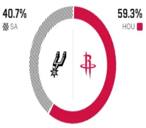 赛前,美媒ESPN对本场比赛进行了胜率预测,火箭队胜率依旧高达59.3% ,占据绝对上风,马刺胜率则仅有40.7% 。